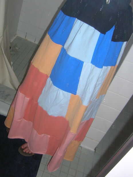 Se trata de una falda de reciclado-t-shirt que hice para un amigo. Es una falda con gradas, de patchwork. El patrón es ajustable para más tela tiene (dentro de ciertos mínimos).