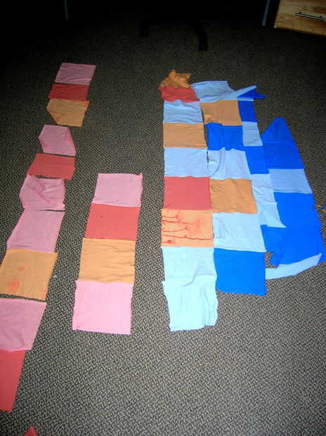 puntada por t-shirt tejido con 16 Fat Quarters y camisetas recicladas. Terminado tamaño 66 "X 80".Paso 1: Lista de materialesLista de la compra:Grasa 16 cuartos (17 "X 20"),Reciclar camisetas limpias,Fusible-mallas para estabilizar cam