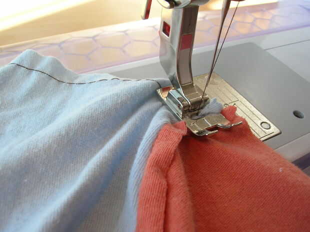 Cose un hilván de puntada (como la máquina de coser le permitirá) en la parte superior de cada círculo de tela (excepto la superior, que será en tu cintura). Tire el hilo superior para recoger hasta la tela es del mismo tamaño que la tela por encima de él. Coser juntos.