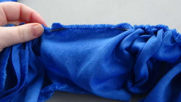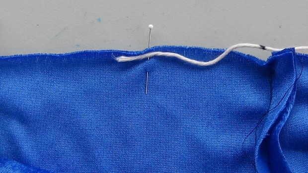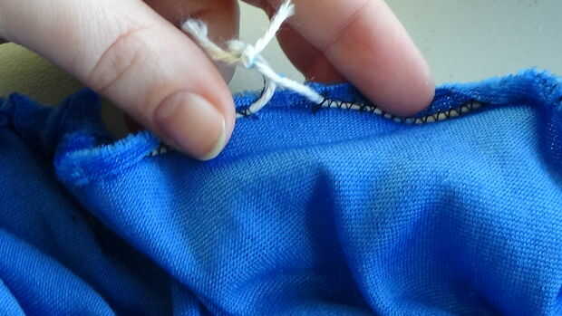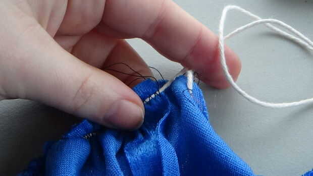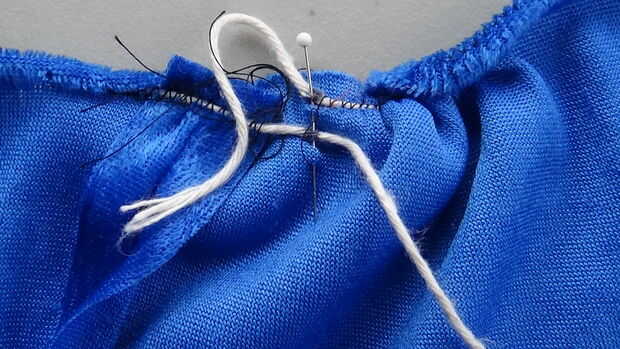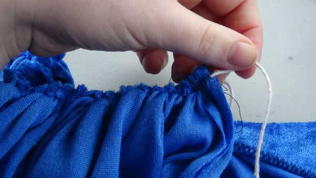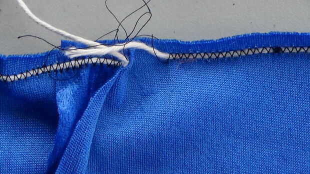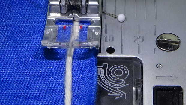 Atropellar a su máquina de coser y configurarlo como una puntada de zig zag que es más ancha que es larga. Luego la tela para que se ejecute justo en el borde del pie poner y la cadena para que se ejecute por la mitad del pie. Luego coser, teniendo cuidado de que la aguja nunca pasa a través de la cadena solamente alrededor de él.