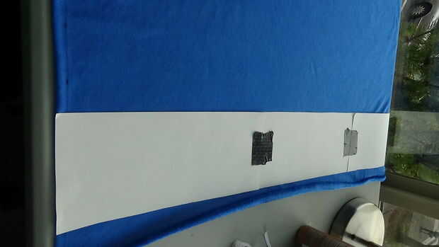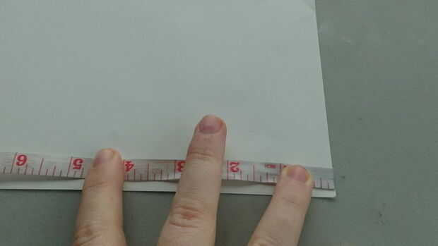 Con el fin de cortar toda la tela en tiras te recomiendo cortar un trozo de papel que es de 5 pulgadas de ancho y 30 pulgadas de largo. Esta manera cubre toda la anchura de la tela plegada por la mitad longitudinalmente.