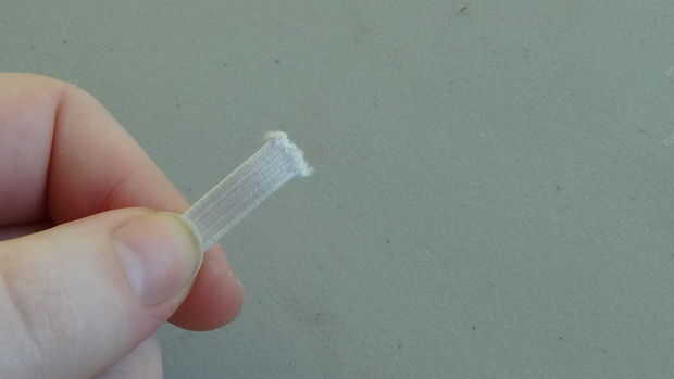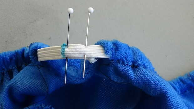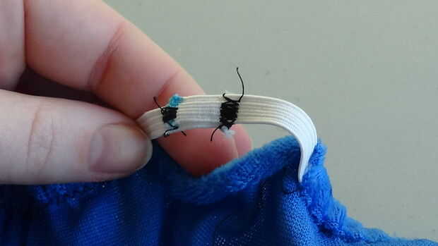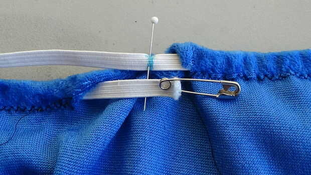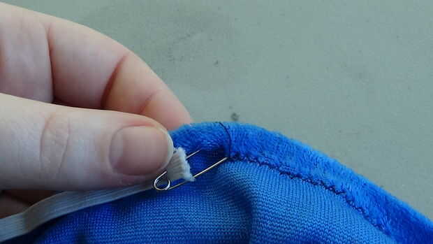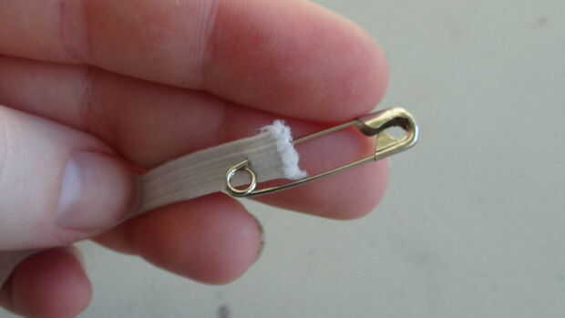 Tomar un alfiler y ponerlo a través del elástico al final que has agarrado.