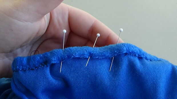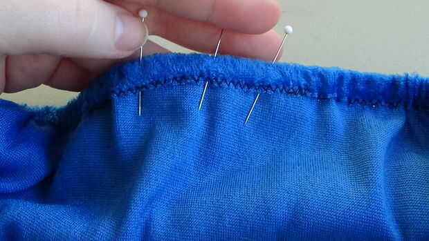 Luego pegar en la caja que acaba de hacer hacia fuera de la parte superior de la falda. Con los dedos de alimentación el elástico por la parte superior de la falda, asegurándose de no dejar que el otro extremo del elástico en la carcasa. Una vez que el perno de seguridad ha venido hacia fuera el otro extremo, retire el pasador de seguridad y sobre los dos extremos del elástico de la vuelta por una pulgada y pin en su lugar. Coser con una puntada de zig zag sobre cada extremo expuesto.
