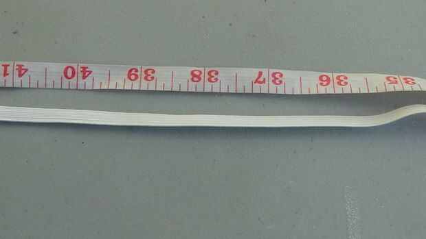 Sacar su elástica y medir una longitud que es de al menos 5 pulgadas más corto que su medida de cintura real y luego añadir 2 pulgadas. Esta longitud del corte y luego coge uno de los extremos.