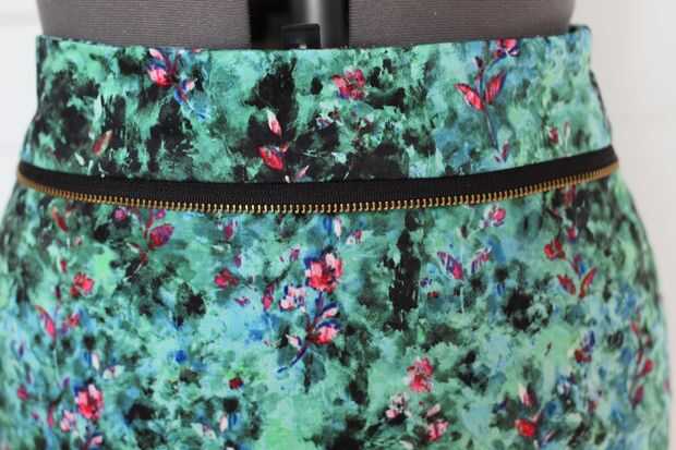 Después de que la cremallera se cubrió muy bien entre el cuerpo de la falda y la pretina, coser la pretina y la cremallera de la falda.