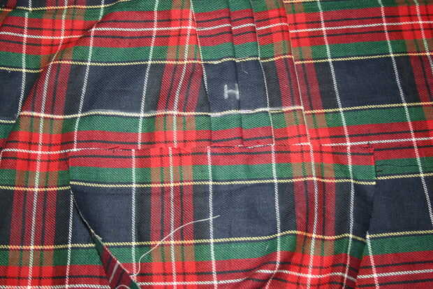 2) decidir sobre el patrón de pliegues y bajo ancho de pliegue. Usted tiene que decidir cómo ancho desea los pliegues, y la profundidad que desea. Quería los pliegues finales seguirá el patrón de la tartan (ver la tercera foto abajo). También quería estrechos pliegues. En este tartán, el patrón había repetido cada 4-1/8 pulgadas. Finalmente decidí que utilizaría 1/4 º del patrón, o 1-1/32 pulgadas, mi anchura del pliegue, y 1 completo del patrón como el bajo ancho de pliegue, igualando 5-5/32 pulgadas por pliegue. Así que toma 5-5/32 pulgadas de tela para ampliar la falda 1-1/32 pulgadas alrededor de la cadera.