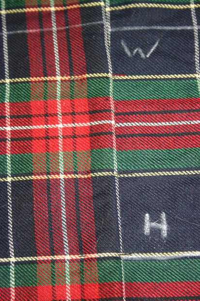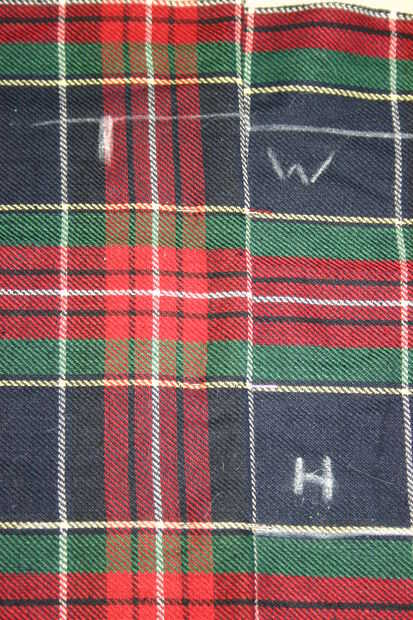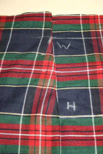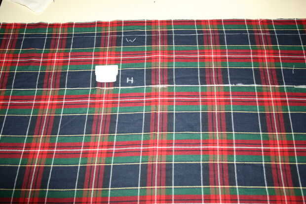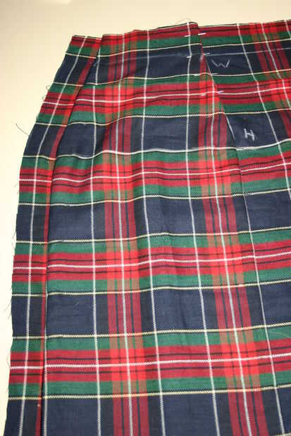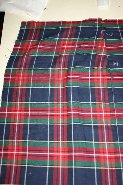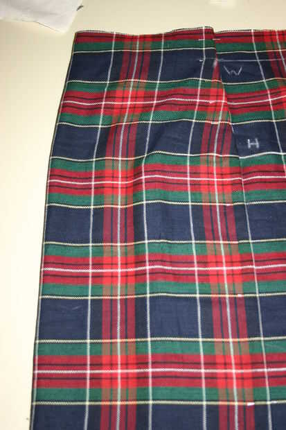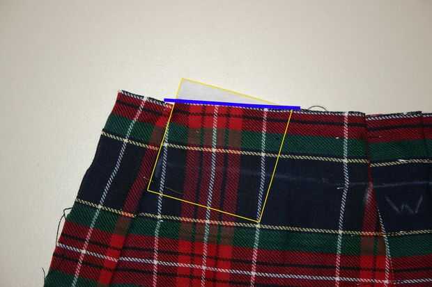 Aquí está una lección aprendida. Después añadimos una correa, sólo hasta el borde del faldón delantero. La correa causará el dobladillo tirar y causar el kilt se aflojen con el tiempo mientras que usado. Cortar un trozo de entretela 3" por 3", y prender en la tapa delantera, con la esquina superior izquierda que se pega encima del borde superior. Cortar la entretela en el borde superior. Usted podría incluso hacer la entretela la longitud del faldón y en el bajo plisado, una forma de Trapazoid que empareja el top 3" del delantal delantero, por lo que se une a la longitud plisada, quitando cualquier resto posible estirar. (Pensando mientras escribía) (Imagen 9)