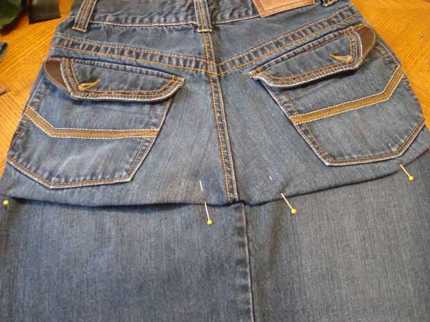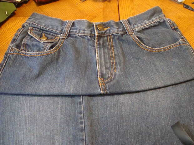 El perno del lado derecho de la parte delantera de la falda en el lado derecho de la pierna de jean girando bajo el borde como se muestra. (Intentar centro de la costura si pueden si no intenta establecer de que se vea mejor.