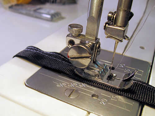 Coser los cuatro líneas paralelas de hilo conductor de la cinta, manteniendo todo el hilo conductor en el mismo lado. Me gusta dejar largas colas – alrededor de 12 – que me permita a mano coser la cinta a otros componentes sin necesidad de empalmar el hilo.