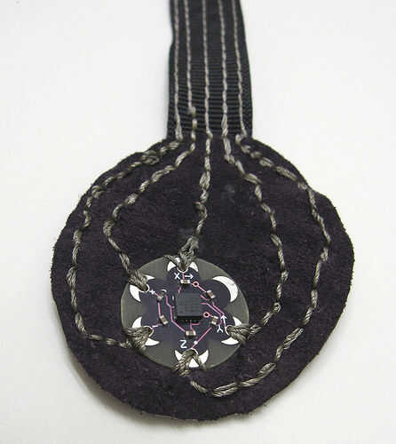 Para conectar un rastro de hilo conductor a lo pétalo de conexión lilypad, simplemente coser el pétalo con un par de puntadas del hilo conductor y nudo en la parte posterior de la pieza. Clip de rosca extremos cortos - para evitar que los extremos de hilo conductor aseado, me gustaría poner un pequeño punto de pegamento fray-check o tela en mi hilo después he lo anudado y luego cortar el pegamento.