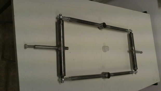 la primera parte a construir fue el mecanismo de inclinación/dirección. como se puede ver en la primera foto la parte central son cabezas de bola que permiten una inclinación de 30° (2 x 15°) y, al mismo tiempo, el giro de los ejes de rueda. en la segunda imagen se puede ver cómo inclina.