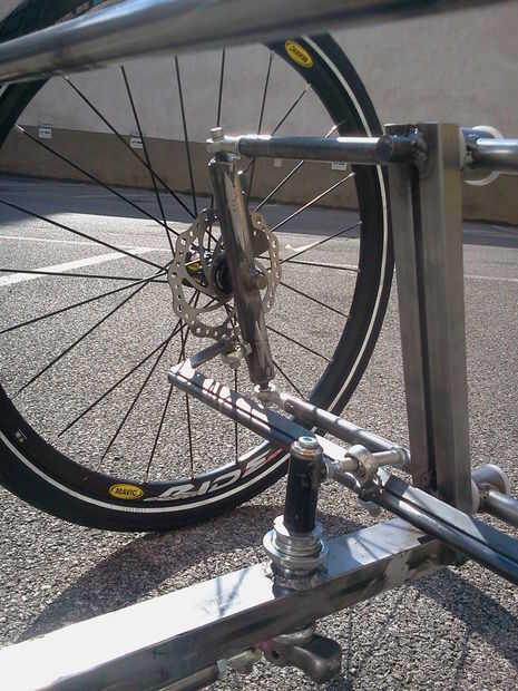 ahora venía la parte más difícil: construir el mecanismo de dirección. empecé con el diseño de manejo generalmente usado con 2 bicicletas de carga de rueda (ver:) pero me tomó bastante tiempo averiguar cómo transmitir la fuerza de manejo adecuadamente a ambas ruedas sin permitir que todo se bloqueo en cualquier ángulo. no quiero ir demasiado en detalles pero espero que el principio es visible en la foto.