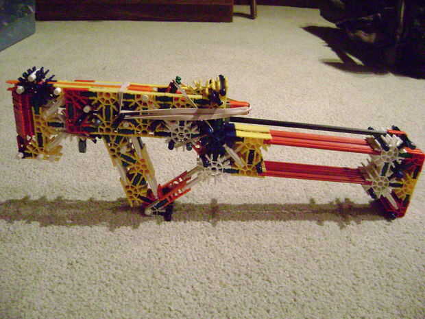 que quería hacer un rifle de oodammo, y esto es lo que hice. Me gusta la empuñadura y el gatillo, pero la baqueta de fusil no era suficientemente largo para golpear la oodammo y carga el siguiente derecho redondo. Apenas aprovecha, para cuando la próxima ronda pops up, termina por delante del ram, no debajo de él. Me gustó también cómo la acción simplemente saltó una sección de la unidad y salió, y la manera de la guía de perno se une solamente a un lado. Oh sí, el gatillo tiene casi tantos grupos como desee, se basa en el mismo principio como gatillo del Rifle de Racker.