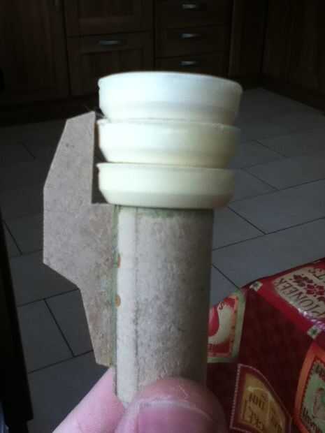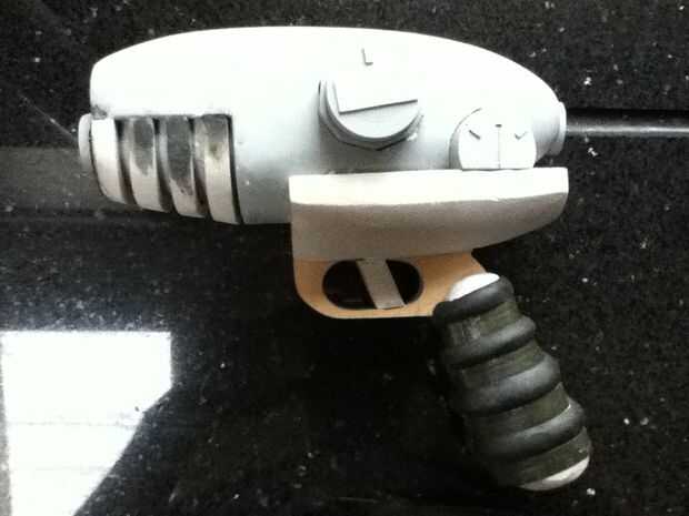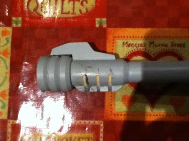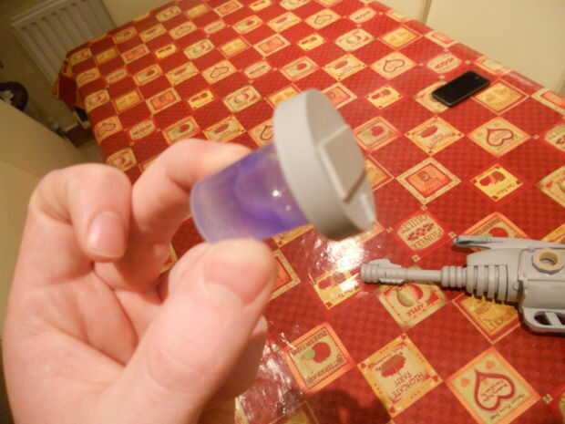 Hice la célula de energía de la blaster Alien de una tapa de crujido de sol y algún gel para el cabello luego la pegué en la parte posterior de la línea de MDF.