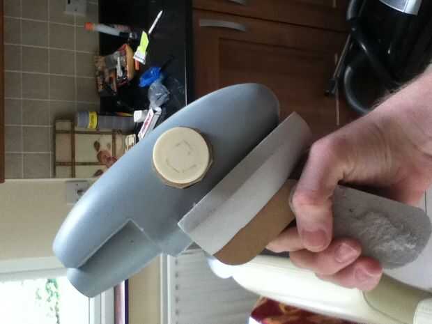 Después de que me marcado donde tuve que cortar todas las aberturas de ranura en los botones, diales y el mango usando el Dremil. Los botones y diales se hicieron con el torno así. Al finalizar todos los agujeros se me adjunta la manija en la parte inferior de la carcasa y había ranurado de un bloque de espuma gris que para entonces podía arena en el mango terminado. Una vez que fue terminado pongo anillos de milliput alrededor de él para hacer la empuñadura.