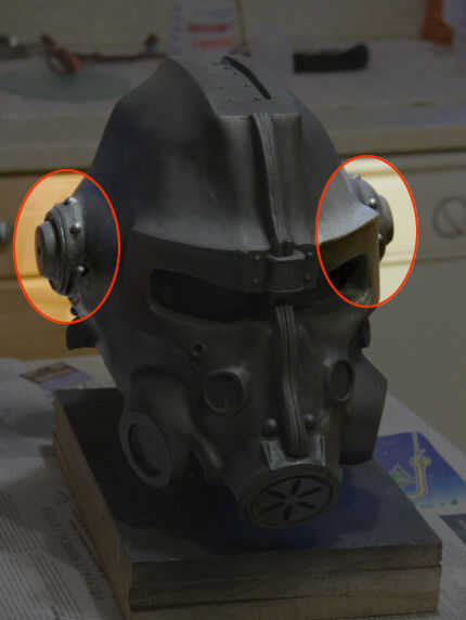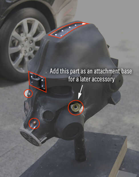 Usted tendrá que añadir dos detalles que no decorativo. La primera es una forma circular de 1 pulgada por debajo del ojo izquierdo (si usted está mirando a la izquierda) y el segundo es un botón anillo en el "hueso de la mejilla" justo debajo del ojo derecho. Puede crear la primera forma con espuma o kit de la fiesta de una rueda en un kit (yo usé un disco desde un lanzador móvil de Scud). No importa si es detallada ya que es realmente sólo va a servir como una superficie de montaje de un accesorio que construiremos más adelante.