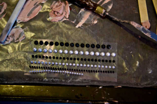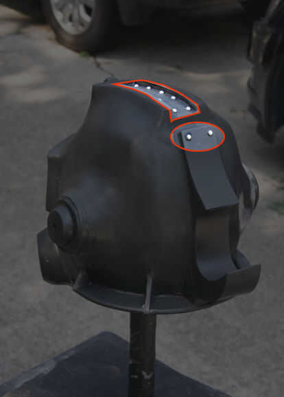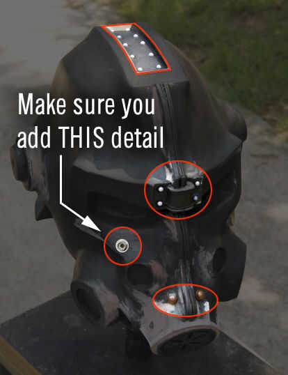 Primero, tenemos que añadir los tornillos que le dan el casco ese aspecto pesado, remachado. Arte tiendas como AC Moore y Michaels llevan botones de perlas falsas en sus joyas y secciones de scrap-booking muy convincentes que los pernos (véase los cuadros). Mientras que estos botones tienen espalda pegajosa, aún necesitarás utilizar algún pegamento y masilla para pegar y mezclarlos. Las fotos presentan altos puntos iluminados en el casco donde los tornillos botón tendrá que ir. Sin duda se dará cuenta de que el casco ha sido pintado de negro. Cuando hice este casco especial, me había olvidado añadir los botones hasta que después de la fase de cebado cuando se lo debería haber hecho en esta etapa.