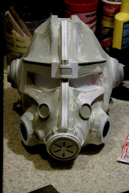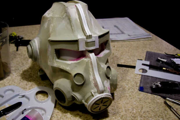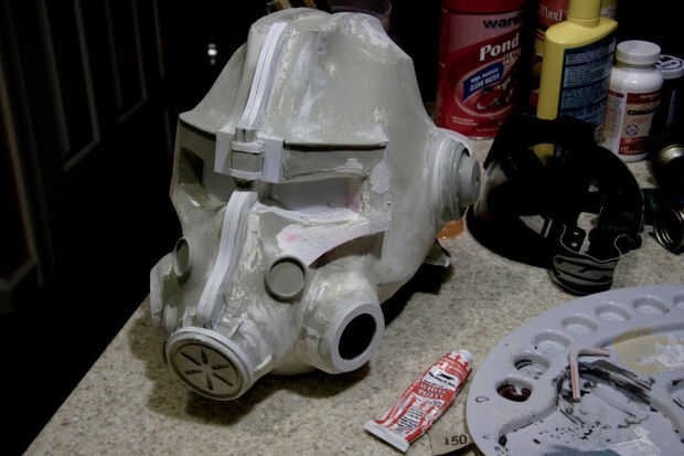 Hasta este punto, los ojos habían quedados abiertos en el interior del casco. Tendremos que cerrarlas para que podamos hacer absolutamente seguros que el fundido final tendrá una superficie plana que puede acomodar el visor interior. Simplemente corte una pieza de cartulina y aplicar al interior del casco donde estarían sus ojos. Sellar los huecos entre la visera y casco con compuesto de juntas o masilla.