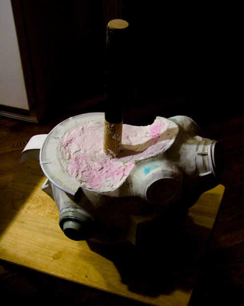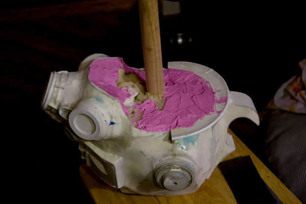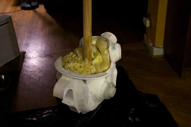 Hasta ahora, la parte inferior del casco había sido dejada abierta para la portabilidad pero ahora hay que sellarla para arriba. Usted necesitará primero coloque un pasador de 1 pulgada en el centro del casco. Esto no sólo sirven como soporte del casco una vez derecha sino que también sirven como el agujero Vierta la resina. Usted necesitará llegar a esta posición antes de llenarlo y sellarlo porque el relleno y el sellador sostienen en lugar.
