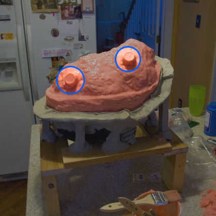 Otro lote de silicona la mezcla y vierta porciones pequeñas en pequeñas tazas o una bandeja de pintura. Vamos a utilizar estos para el registro de las llaves que ' permite el molde para bloquear con el molde de chaqueta (ver las áreas en un círculo en la imagen). Permiten curar y aplicar el resto de su lote con un pincel para cubrir la capa de impresión. Permitir que esto cura durante 8 horas.