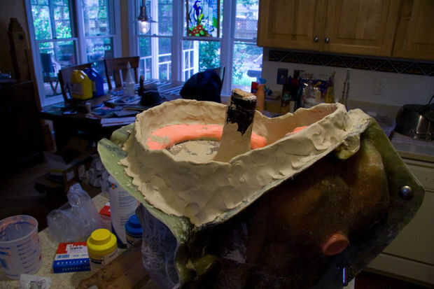 Vuelta el casco para que la parte inferior hacia arriba y eliminar las restantes paredes de arcilla que dividieron la parte frontal del casco de la parte posterior. Construcción de una nueva arcilla que contiene la pared sobre la fibra de vidrio expuesta.