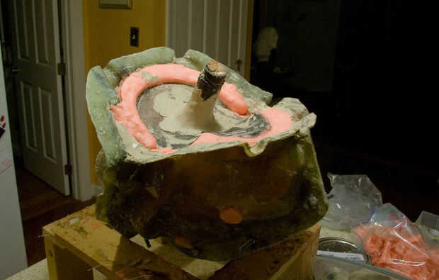 Una vez todos del silicón se cura tienes que cortar alguna silicona que puede haber curado cerca de la parte superior de la espiga. Se trata de nuestro pico para verter en la resina más tarde. Cortar y guardar el exceso de silicón antes de comenzar el molde de chaqueta de la parte inferior.
