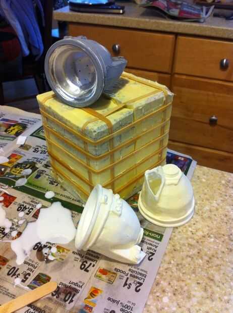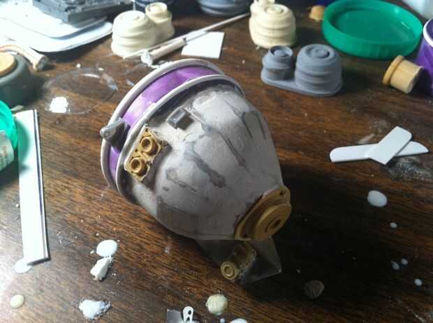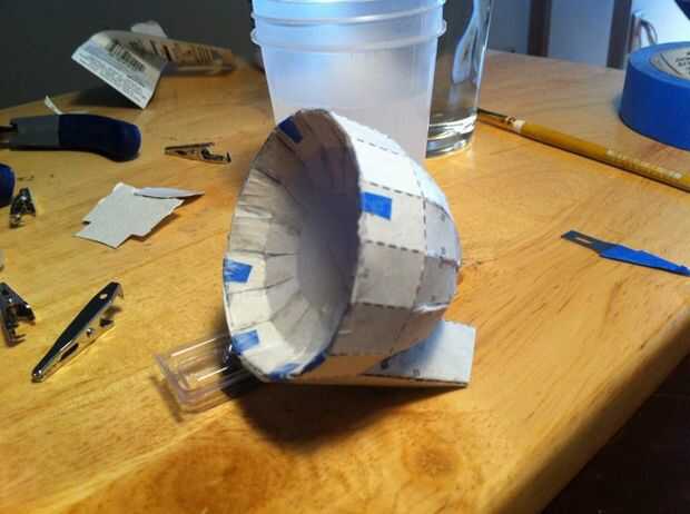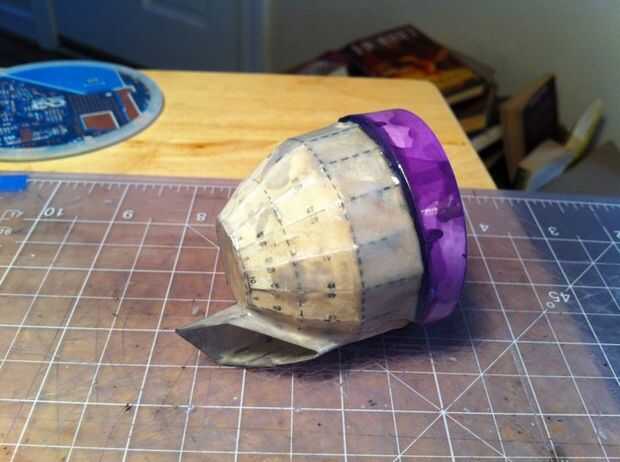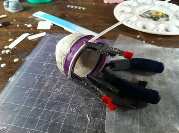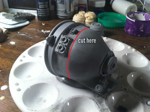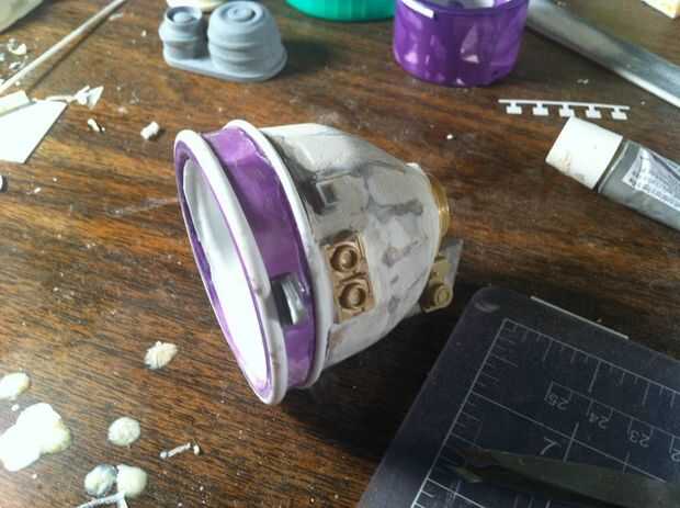 Montar la lámpara de cartulina como lo hicimos al construir el casco. Debe estar familiarizado con el proceso por ahora. Cuando haya terminado usted puede Agregar una sombra angosta alrededor del borde de un pedazo de tubo de PVC (es la parte de color morada en la foto). Entonces tienes que comenzar a alisar hacia fuera la forma de las "polys" con una aplicación de modelado masilla Squadron. Arena hacia abajo y repita como sea necesario hasta que la forma de la lámpara es suave y agradable. Una vez que termines puedes comenzar añadiendo estireno kit-bashed trim y pequeños detalles. Prime la lámpara para asegurar que todo es uniforme y llene adentro cualquier boquete abierto que pueda quedar. Necesitamos moldear y aguanieve la lámpara desde el modelo de tarjeta de material es demasiado endeble para que el corte nos va a hacer. La lámpara debe sellarse completamente antes de hacer esto sin embargo.
