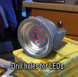 Una vez que han tirado el molde del molde que tendrá que preparar para el cableado que está por venir más tarde. 9 agujeros de taladro en la taza de la lámpara (como se muestra en la imagen) y luego corte la lámpara a la mitad. Esto le permitirá a los LEDs a través de la parte inferior del tazón de fuente del hilo de rosca.