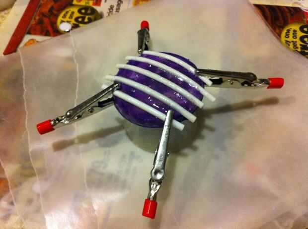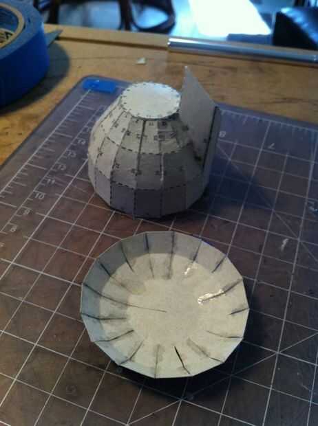 La última parte que tenemos que construir es el "vidrio" sobre la lámpara. Para esto utilizamos algunas Apoxy Sculpt y estireno. Apoxy Sculpt es una arcilla de modelado en 2 partes con una proporción de 1:1 que se endurecerá después de que combina. Mezclar una porción lo suficientemente grande como para cubrir la taza de la lámpara. Forma y alíselo en una cúpula poco profunda. Puede utilizar agua para suavizar los golpes. Incluso se puede lijar una vez que es curado completamente en unas pocas horas. Una vez que tenga una forma de cúpula dura que puede comenzar estireno media super pegado tiras sobre la superficie de la cúpula. Estas tiras forman las crestas en el "cristal".