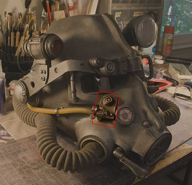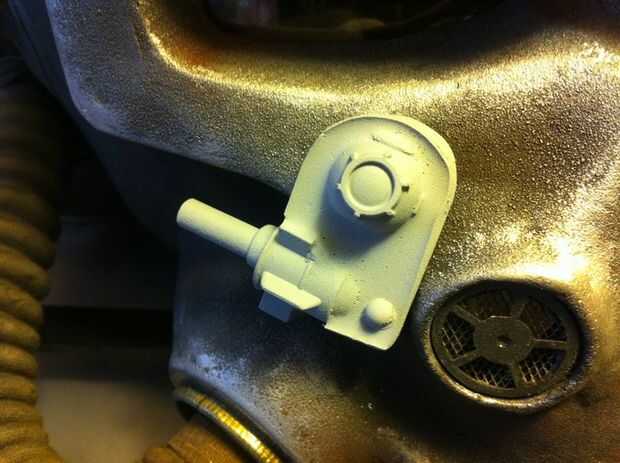 Corte el exceso de resina hasta que tenga una forma que se aproxima el inyector final en mis fotos. Construir sobre el mismo con pequeñas aplicaciones de Apoxy esculpir hasta que haya algo que se puede lijar hacia abajo sobre una superficie plana lisa. Detalle que la superficie quieras (yo usé piezas de un viejo kit de estación espacial Mir) pero asegúrese de que su parte final tiene una longitud de 1 pulgada de varilla de estireno que posteriormente podemos utilizar para conectar la manguera de látex amarillo que recorre el lado derecho del casco.