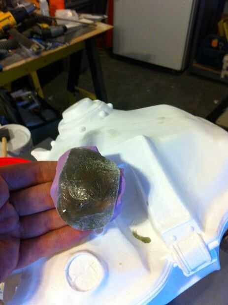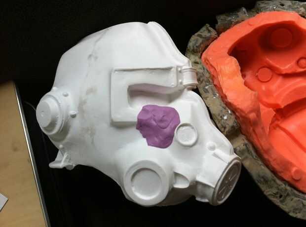 La boquilla de extracción de humedad es un poco más complicada porque se requiere adaptación a la superficie del casco. Usaremos masilla de silicona para hacer el molde de la cara del casco para crear la parte inferior de la boquilla de extracción de humedad. Esto captura los contornos de cascos y asegurar un ajuste perfecto. Masilla de silicona es una mezcla de proporción simple, parte 2, 1:1 que ruedan juntos a mano. Una vez que has amasado las 2 partes juntas puede comenzar presionando contra el área en la imagen del casco donde se acoplarán la boquilla. Debe añadir una chaqueta pequeña de fibra de vidrio a la masilla después es curado por lo que mantendrá su forma después de quitar la masilla del casco.