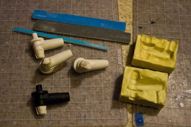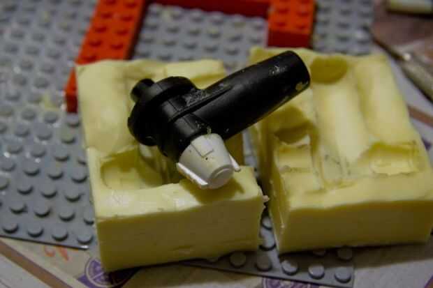 Otra vez, estaba seguro de qué tan bien estas partes sostendrían juntos a largo plazo (ser hecho de diferentes materiales) por lo que hizo un molde simple de 2 partes y la parte del molde. Añadí una varilla de estireno de 1/4 de pulgada en la base (donde conecta con el casco) y taladrar un orificio en el extremo donde más tarde se conectó el cable.