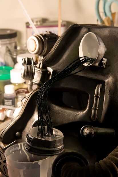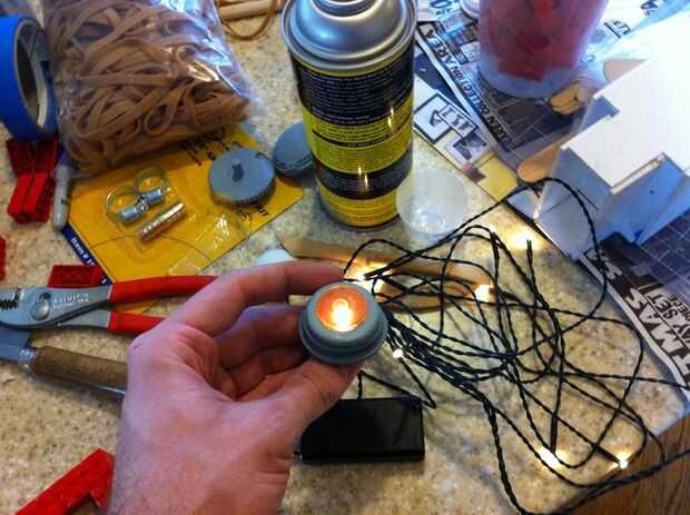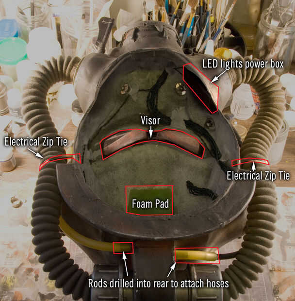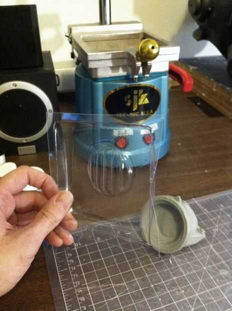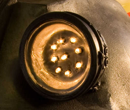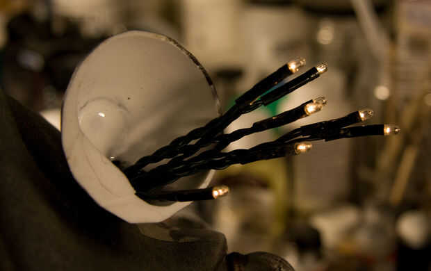 Tome la lámpara accesoria y fijar en su lugar sobre el agujero perforado en el lado izquierdo del casco. Asegúrelo con epoxy y plomería masilla y deje que se cure. Tirar el paquete de 9 luces a través del agujero y la parte abierta de la Asamblea de la lámpara. Enchufe cada luz en los 9 hoyos a través de la parte posterior de la "taza" como en la imagen. Asegure cada tallo de LED con un poco de masilla y deje curar. Pegue el "tazón de luz" en el conjunto de la lámpara. Tome el pedazo de "vidrio" que hiciste con el vacío anterior y pegar en Asamblea por lo que recorre la luz.
