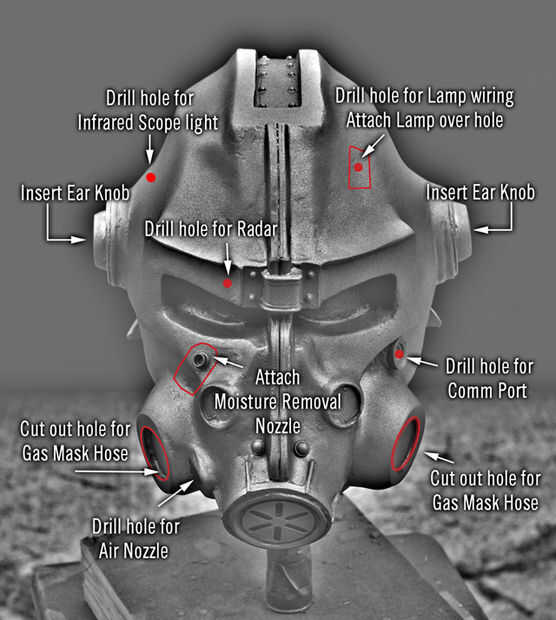 La fijación y montaje de la lámpara y el alcance infrarrojo es probablemente el más difícil el proceso de montaje pero el más gratificante una vez que vea que encendido para arriba. Comenzar por la perforación de agujeros en el casco para el cableado de la lámpara y alcance infrarrojo como se muestra en el diagrama. Coloque la caja de la batería LED dentro del casco como se muestra en el diagrama de otro y epoxy en su lugar. Hay 10 luces conectadas a la caja de batería. Paquete 9 de ellas junto con lazos de torcedura (el pequeño papel/alambre que se usan en la cocina) y serpiente en el interior del casco y fijarlos en su lugar con bolitas de masilla de plomería. Deje bastante el paquete libre de tirar aunque el agujero y en la lámpara. Debe haber un alambre y enciende a la izquierda. Esto alrededor de la serpiente y fijarlo en su lugar con masilla y tire de ella a través del orificio perforado para el alcance infrarrojo.