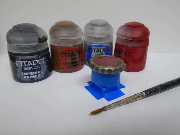 La tapa cuenta con un centro rojo y un borde de plata. Utilicé pinturas acrílicas modelo para lograrlo. Yo como marca "Ciudadela" es fuertemente pigmentado y no requiere capas múltiples para un buen color pero otras pinturas modelo funciona muy bien así.