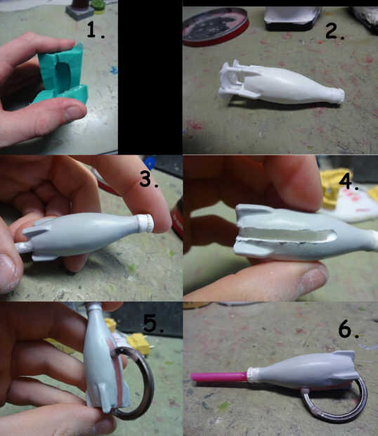 en el primer cuadro de la primera foto ^ ^ se puede ver el molde de basura y chatarra fundido procedente de smoothcast D 65 (2) en la fotografía (3) pongo en spary relleno y lo lijado cuadro de .on (4 º) se puede ver que hice espacio para el llavero. el plan es lanzar directamente el aro en la botella porque iba a ser duro para luego en amenaza. así debe ser en el molde. imagen (5) muestra que el anillo esté ocupado con la cera. ahora la botella está lista para ser moldeada (6).