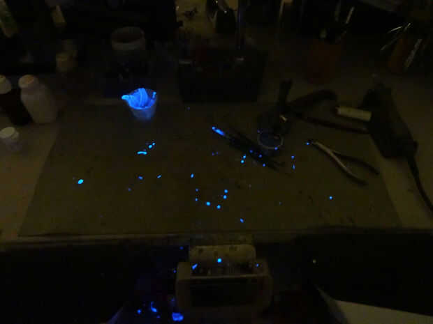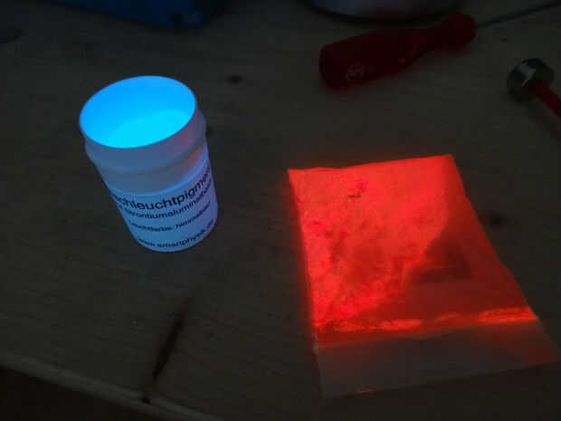 para el efecto resplandor utilizar un pigmento fosforescente azul (stronziumaluminat). será mixta en el material de fundición. en la fotografía vemos el pigmento completamente cargado. Cobré por una lámpara de UV y es extremly brillante brillante. Me encantan estas cosas pero it´s bastante caro
