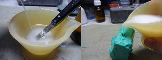 en mezclar el pigmento fosforescente. ---------!!! Atención!!!!!! ---el pigmento es insoluble. significa doesn´t enlace a plástico ni agua etc... eso significa que si viertes el pigmento plástico y el plástico tiene una baja viscosidad, el pigmento se comba en la parte inferior.