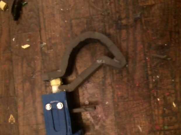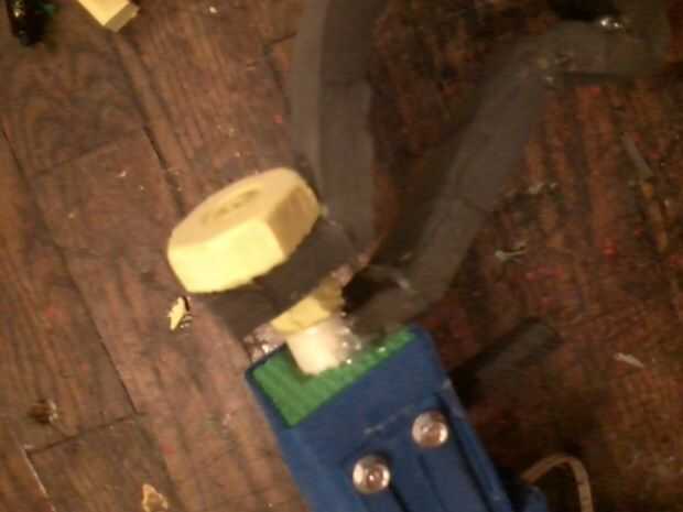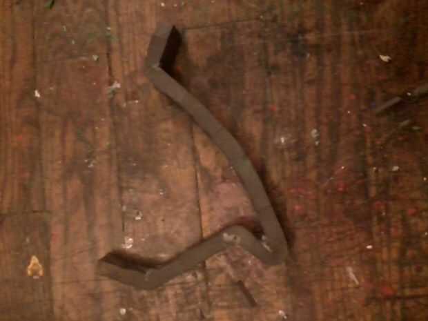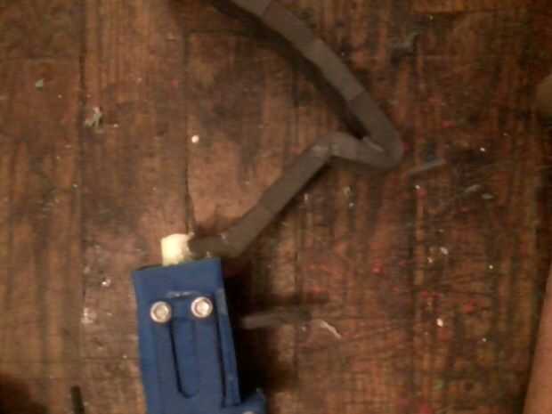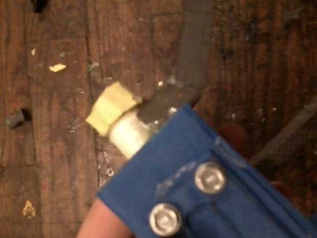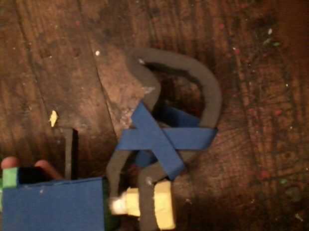 Se trata de una forma muy extraña. Corté una tira de espuma sobre una media pulgada de ancho y 10-12 pulgadas de largo. Corte v en la espuma donde quería ángulos agudos y usé un mechero al calor y forma el resto, que también refuerza. Los 2 extremos necesitan ser cortados para que se deslice sobre el tubo que sale del receptor. Cometí el error de no dejar mi espacio suficiente y tuve que añadir a un espaciador de espuma. Una vez que se deslice en, pegamento en su lugar y luego corte una pieza octogonal como una tuerca. Esta pieza de espuma será la tapa que va sobre la parte posterior de la pieza vertical como se muestra. Se puede detallar con la dremel. Ahora usted puede cortar algunas espuma de arte para envolver alrededor de la manija, esto pretende replicar cinta negra. Añadí un soporte en el centro de la empuñadura para hacerla más fuerte y escondió con la espuma del arte.