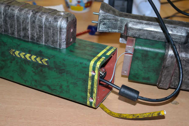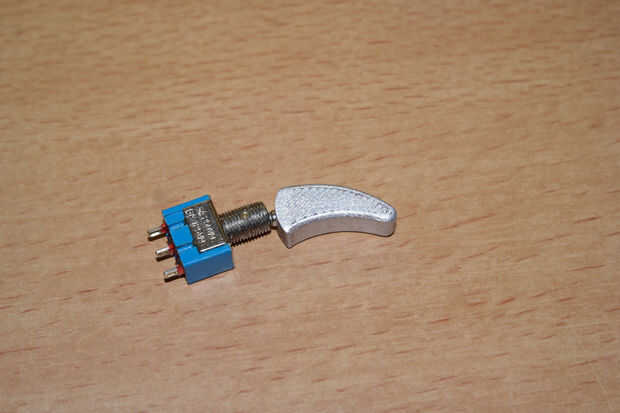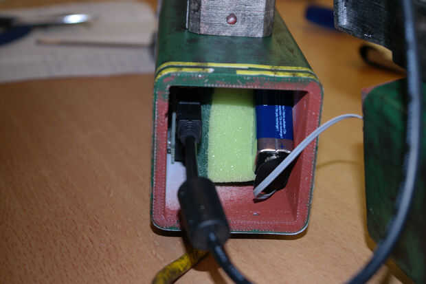 Para los altavoces he utilizado un conjunto de altavoces del ordenador portátil, compactos y bastante ruidosos. Yo agujeros perforados en la parte inferior de la boca el sonido del altavoz. Yo también su el interruptor de encendido en la boca. El gatillo es un interruptor de tambor genérico resorte con una palanca plana. Aquí hay un enlace, aunque está en holandés y no tiene mucha información.