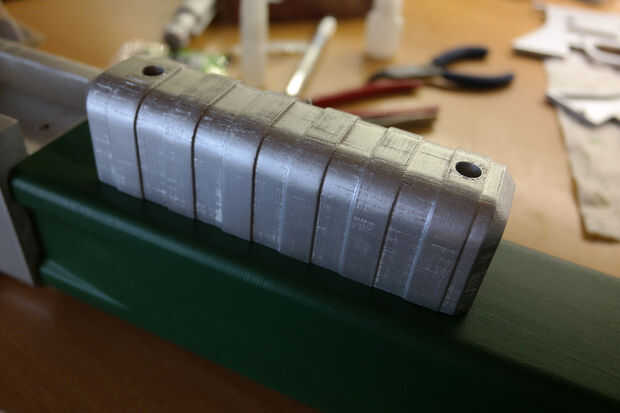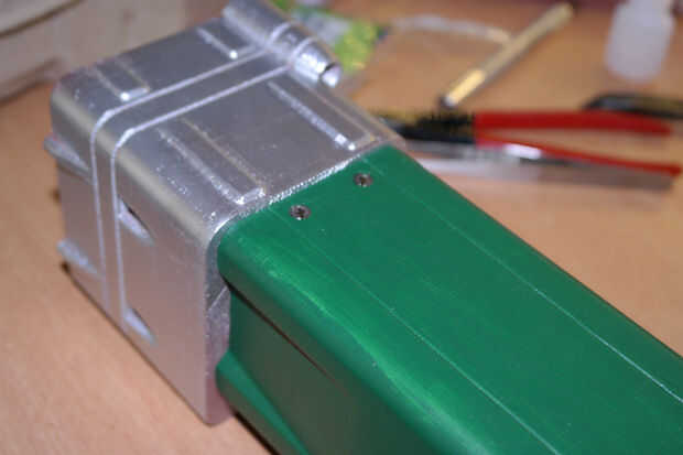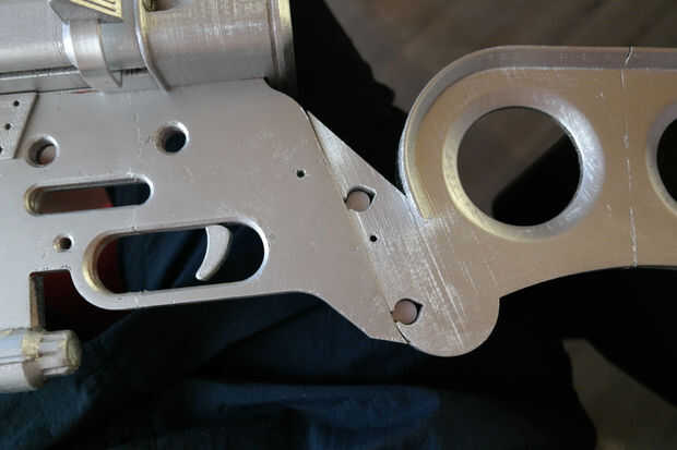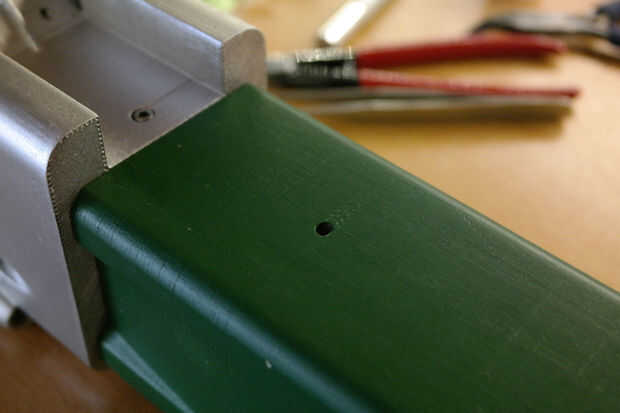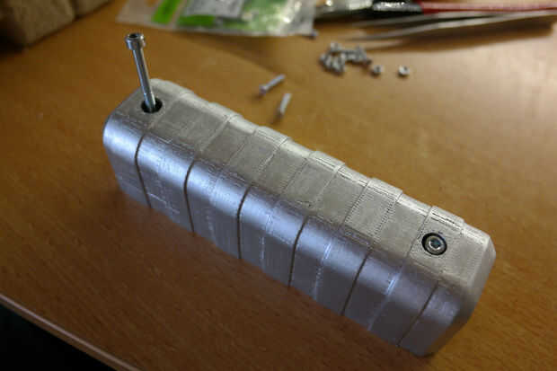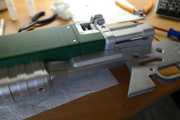 Unas palabras antes de ver el video. Sólo la empuñadura y la culata se llevan a cabo en lugar por las tuercas. Todos los tornillos están roscados directamente en el plástico. El orificio del mango fue grabado con una rosca M3 corte demasiado porque es demasiado frágil para cortar con solo el tornillo.