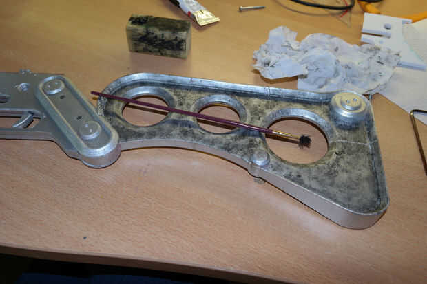 Yo uso un pincel desechable, toallas de papel y pintura de acrílico negro para este paso. Aplicar y muy pequeña cantidad de pintura negra en la punta del pincel. Luego el pincel contra una pieza de madera o plástico hasta mantener sólo una pequeña cantidad de pintura en el pincel. Entonces, cuál es dab se dejaron cuidadosamente en la parte. Si utilizas demasiado, inmediatamente use la toalla de papel para limpiar el exceso. Negro de la pintura en capas este fino ajusta en segundos, así que rápido. Repita hasta que tenga el espesor de meteorización que desee. Este paso puede tardar bastantes horas. Pasé cerca de 12 horas para la capa de suciedad lo que quería.