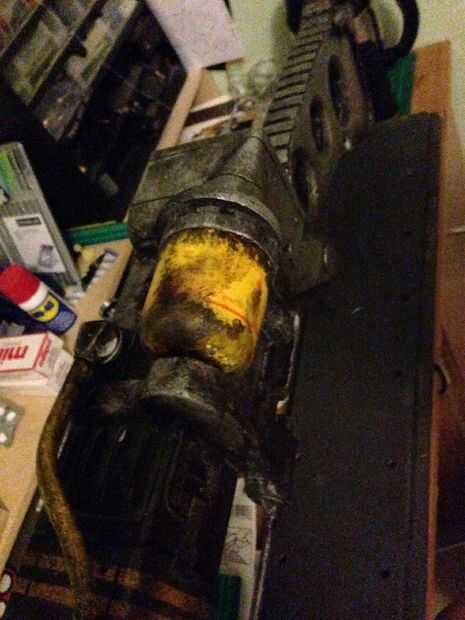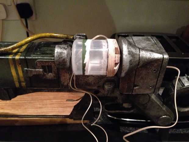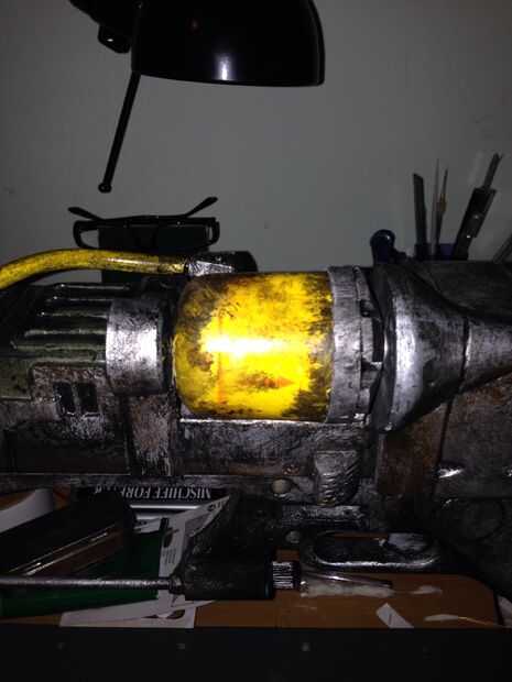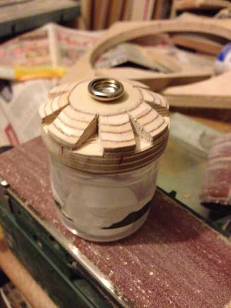 Con algunos restos de 3/4 de pulgada hecha la parte superior del círculo cortando hacia fuera en la sierra, entonces en el círculo que utiliza 1/4 para hacer el detalle en la parte superior, por cortar los triángulos en el 1/4 y enroscarla al 3/4 y lijado redondo, entonces usando un presstud para ajustarse a la pistola por lo que puedo quitarlo si necesito cambiar la batería , la batería encaja el spray puede tapa,