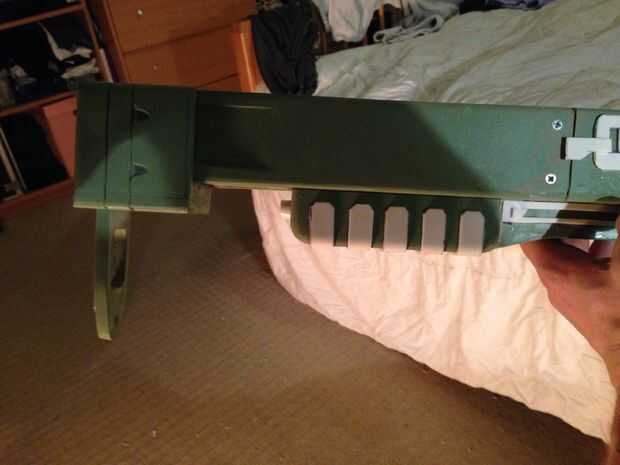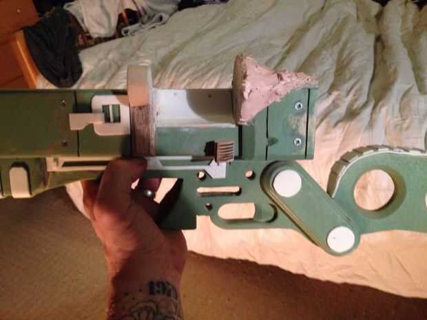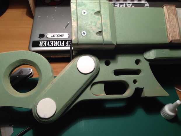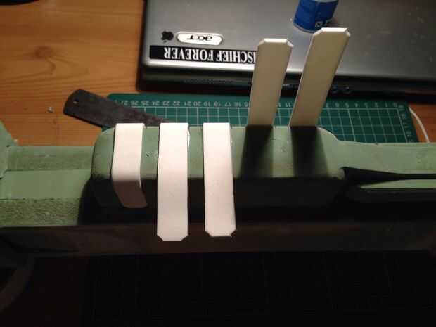 Bien lijar primero, un toque de relleno de madera para poner en orden los pequeños huecos y la construcción principal fue hecho, especie de una rápida capa de pintura en aerosol para sellar pedacitos y es que por ahora, hay un montón de pequeños detalles no podría y no debería hacer de la madera, así que he decidido si uso algunos stock 2mm que tenía de la espuma y corte hacia fuera el otro poco y pegamento en , esto otra vez fue hecha mediante una referencia a los cuadros de la arma del juego y ojo balling tamaños, esto no es fiable al 100% pero es presa cerca, sabía cuando comencé que con el material y herramientas tuve esto no iba a ser contado, pero intentaría hacerlo lo más cerca posible, es otra vez una generación primera, prototipos un poco qué puedo hacer con lo que tengo ,
