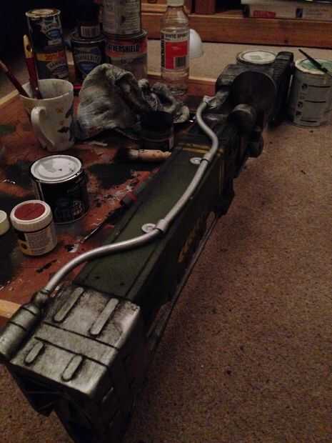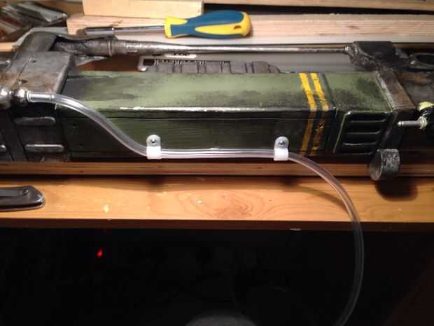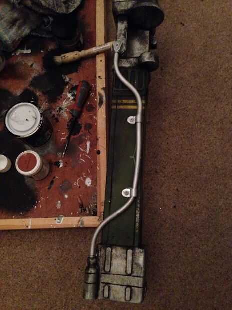En la parte superior del juego gun es una pipa, pensé una mientras le pido a mi jefe me doblar algunos tubos y lo haría de esa manera, pero más pensé, decidí quisiera encontrar tan claro tubo, curva que en su lugar y como el arma del juego, utilizar clips para mantenerlo en su lugar, al final negocio atacado a un pedacito redondo (utilicé un pincel viejo corte de la manija y cepillos que izquierda con el tamaño perfecto para ella, tallado hacia fuera a 90 grados corte en pegamento y pincel y bondo en lugar, cuando pintó encima de él parece correcta) usé un remache cortar hecho Deslice la tubería sobre, y los clips para mantenerlo en su lugar, en el otro extremo una tapa de la pintura de aerosol taladrada y un remache también a recibir el otro extremo de la tubería , pintado de plateado, luego amarillo, luego resistida para que coincida con la pistola.