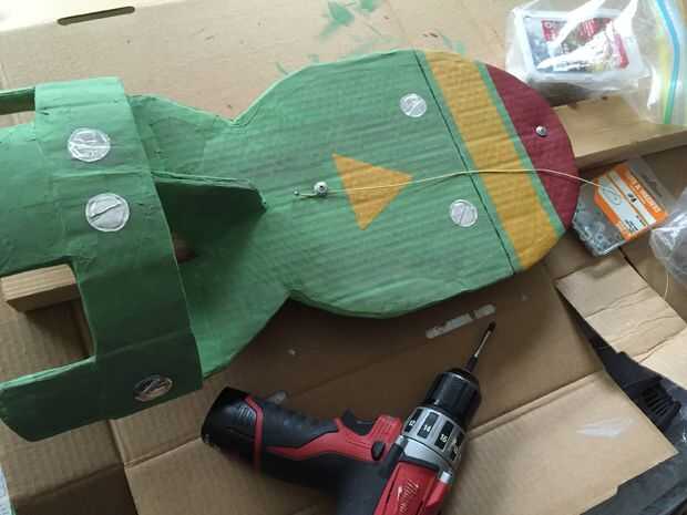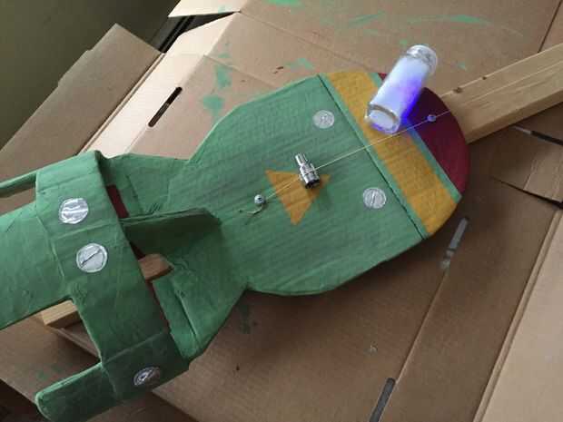 Para que mi diapositiva reproducir el arco de diddley, acabo de poner en un throwie de LED azul en una botella de la coctelera de sal y pimienta. Yo no tenía ninguna mano botellas de Nuka-Cola.