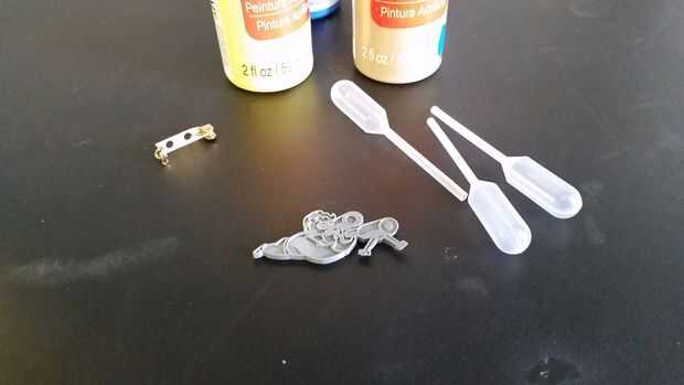 Con el cuentagotas de ojo y pintura acrílico, WARN lleno en las secciones coloreadas de la clavija. También usé el pasador de la aguja de atrás para extender la pintura en rincones y grietas. La aguja también fue útil en la eliminación de algunos pintura rebosante.