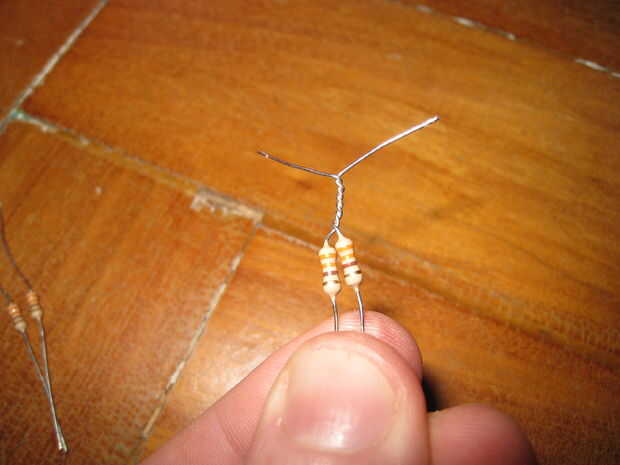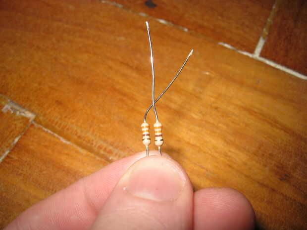 Resistencias son necesarias para limitar la corriente eléctrica que pasa a los LEDs. Sólo de propiedad resistencias de 330 ohmios, y aunque funcionan, no fue tan bueno el brillo de los LEDs. Adición de dos resistencias idénticas en paralelo les hace actuar como una resistencia con la mitad del valor original. Así, dos 330 ohm resistores conectados en paralelo acto como una resistencia de 165 ohm, permitiendo que dos veces la corriente en el LED y aumentando su brillo. Como sólo tenía cinco resistencias de 330 ohmios, el LED amarillo fue conectado con una resistencia de 330 ohm en lugar de otro.