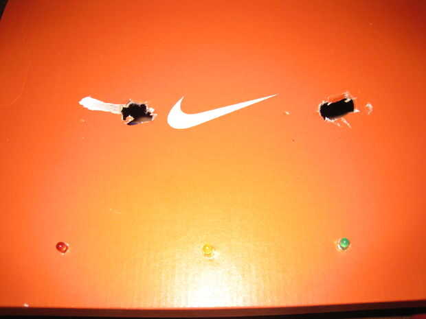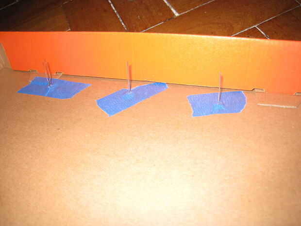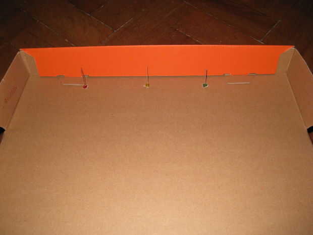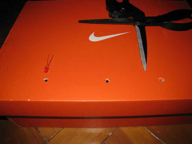 Hacer 3 agujeros con las tijeras, uno para cada LED e insertar ellos desde dentro de la caja. Asegure cada LED con cinta, dejando los contactos expuestos.