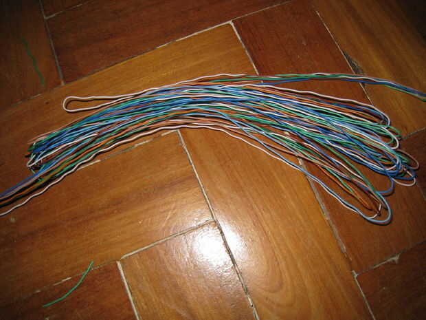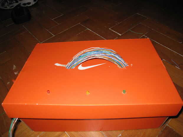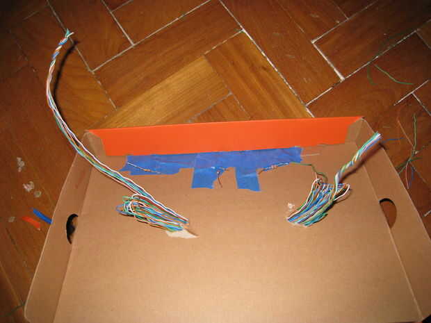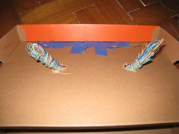 Mezclar todos los cables restantes y doblarlas sobre sí mismas, como se indica en la figura primera. Insertarlos en los agujeros hechos previamente en el cuadro. Así tenemos la ilusión de que existen varios cables conectados al sistema, pero en realidad son varios cabos sueltos que no hacen nada.